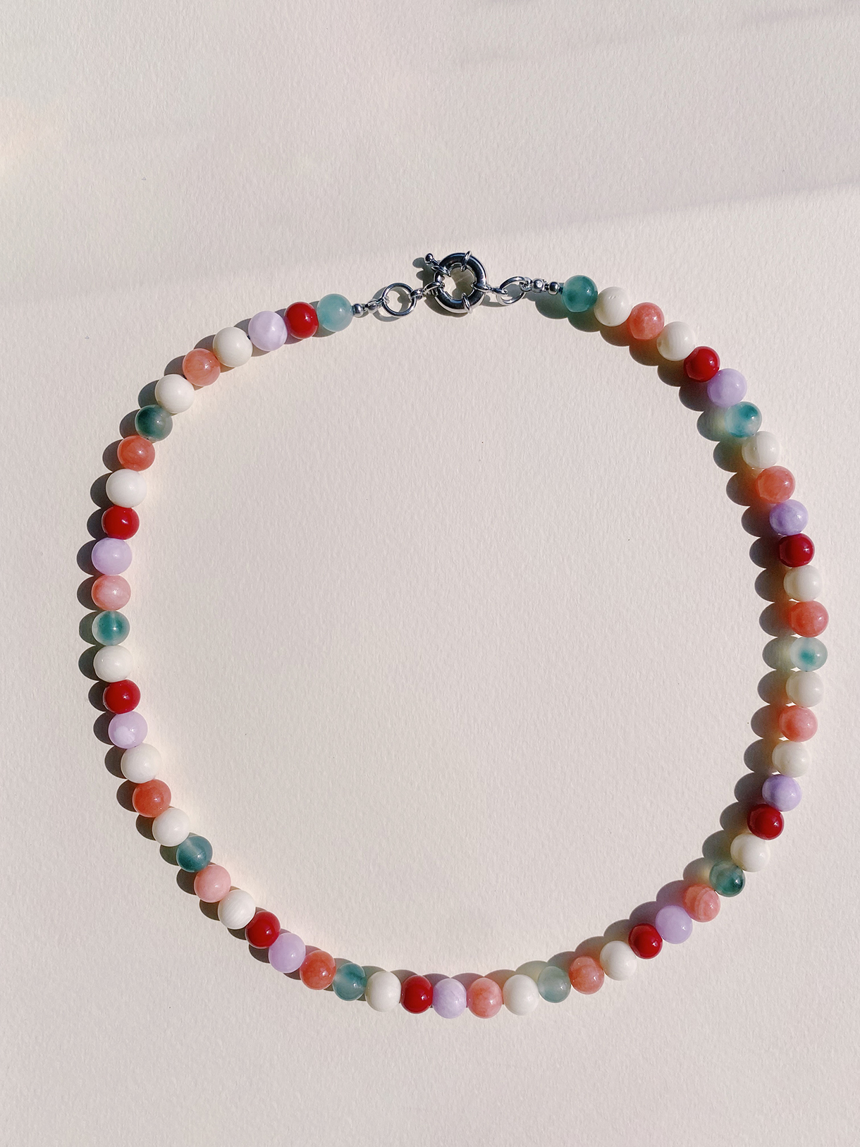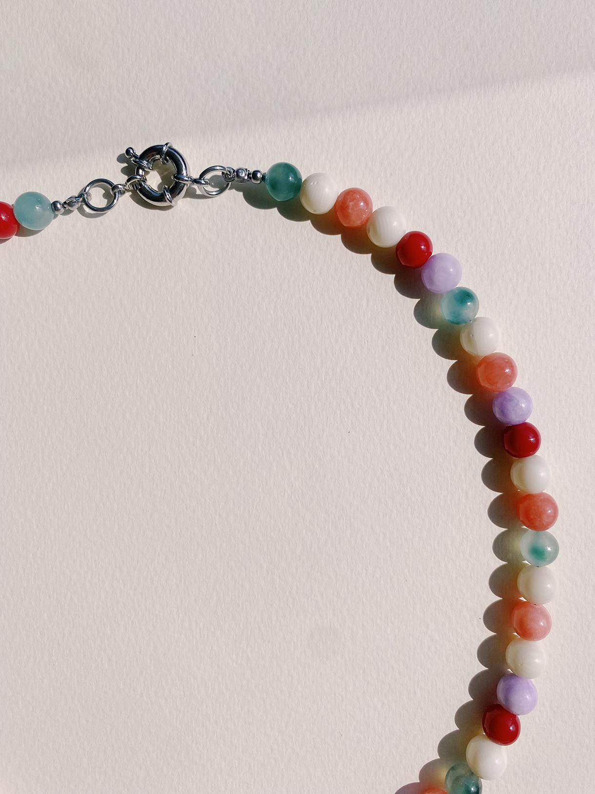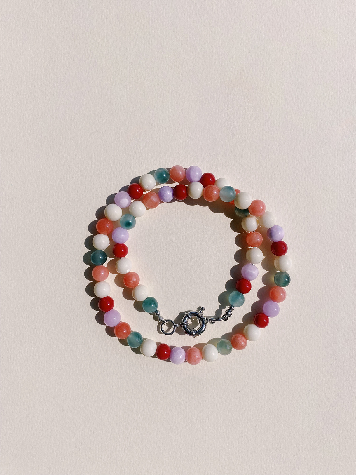 Diseño fresco y colorido, collar elaborado de piedras naturales en tonos suaves y vibrantes, compuesto por jade rojo, que aporta acentos intensos y llamativos, junto con ágata crema, que introduce un matiz neutro y elegante. El jade verde añade un toque de frescura y serenidad, mientras que la ágata naranja incorpora calidez y energía al conjunto. Por su parte, la ágata lila suma un delicado tono pastel que suaviza la composición general.
